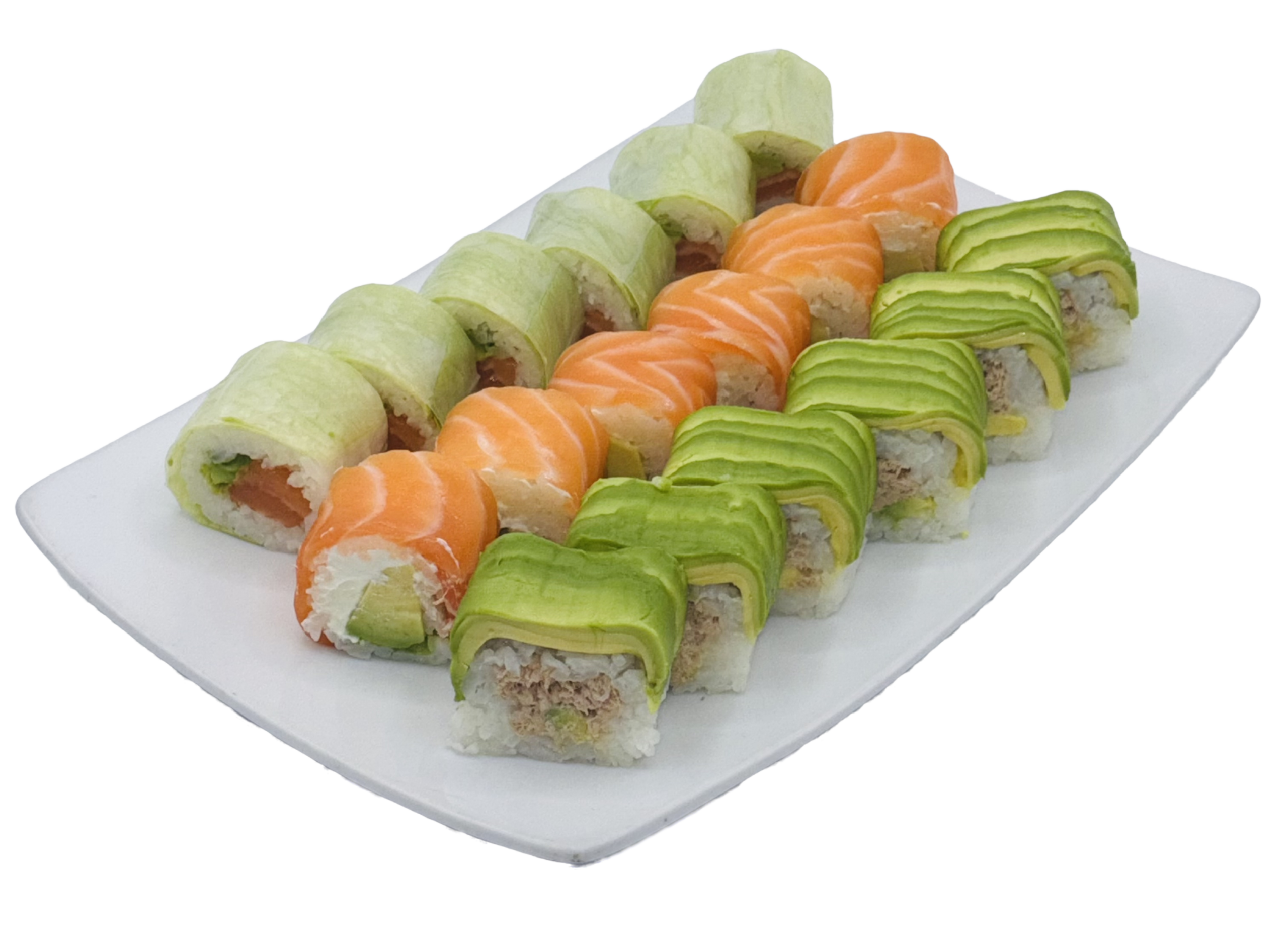 18 pièces: 6 top salade saumon avocat, 6 top avocat thon mayo avocat, 6 top saumon cheese * avocat
